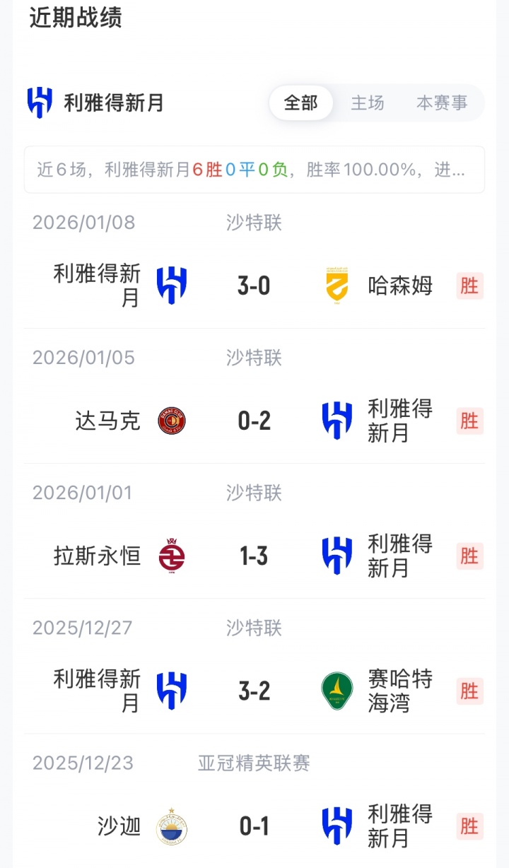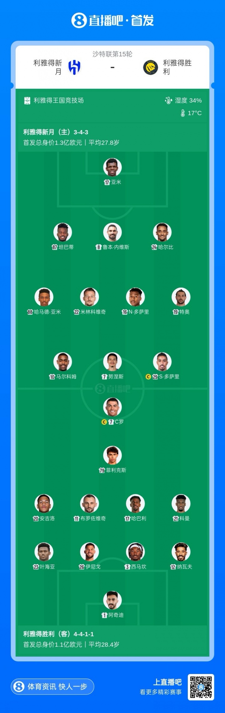 利雅得胜利首发:1-阿奇迪、12-纳瓦夫、26-伊尼戈·马丁内斯、3-西马坎、23-叶海亚、11-布罗佐维奇、17-哈巴利、20-安吉洛、21-科曼、79-菲利克斯、7-C罗